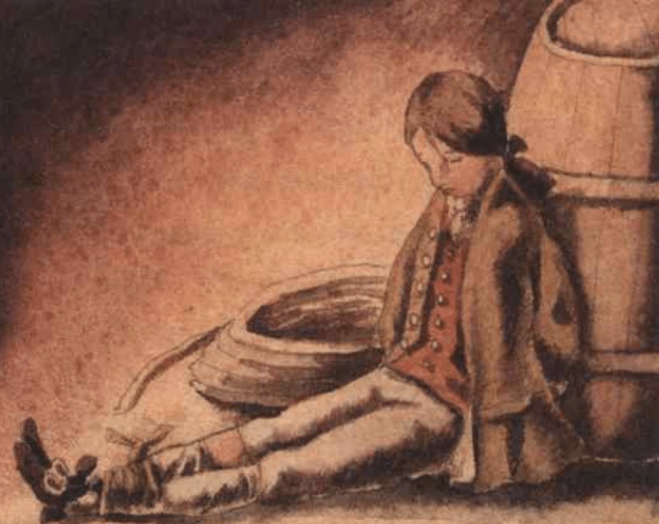 Când s-a trezit, era întuneric. Mâinile și picioarele îi erau legate cu funii și avea dureri mari. Se afla pe corabie și simțea cum aceasta se ridica și cobora cu valurile; îi era rău de mare. A adormit din nou, dar curând un bărbat l-a trezit. Era foarte bolnav: îl durea capul, avea febră și nu voia să mănânce. Apoi a venit căpitanul și un marinar numit Riach, care i-au tăiat frânghiile şi l-au dus sus, pe punte.