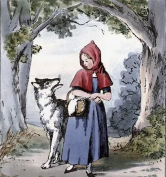 Scufița Roșie merge prin pădure. Pe drum, ea întâlnește un lup. Lupul pare prietenos și o întreabă unde merge. Fetița îi spune că merge la bunica. Lupul are un plan rău. El merge repede la casa bunicii, o sperie și îi ia locul în pat.